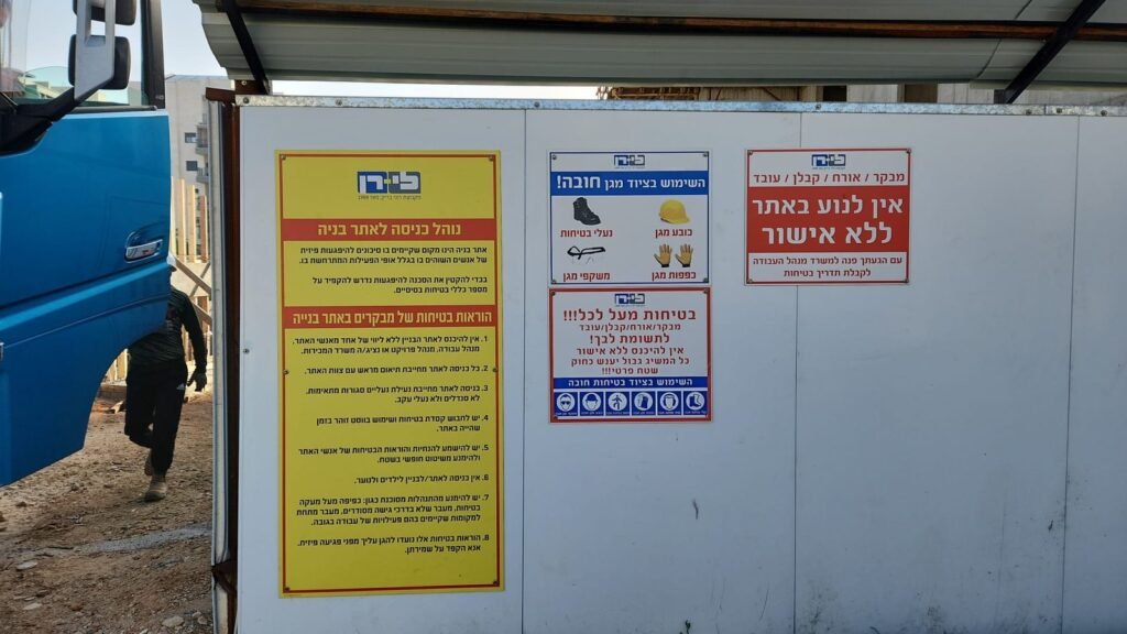 שילוט על כללי בטיחות בעבודה באתר הבניה של חברת מידן לירן של רוני בריק וחביב דהן בהוד השרון ונווה זמר.