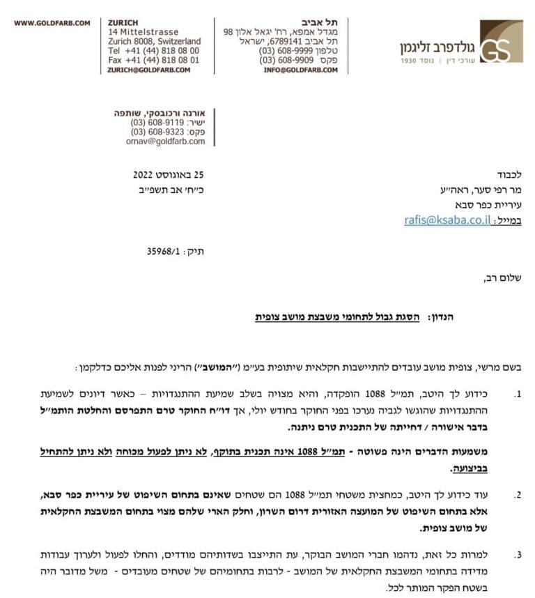 במכתב שנשלח ממשרד עורכי הדין גולדפרב זליגמן מטעם מושב צופית נכתב "משמעות הדברים פשוטה – תמ"ל 1088 אינה תכנית בתוקף, לא ניתן לפעול מכוחה ולא ניתן להתחיל בביצועה"