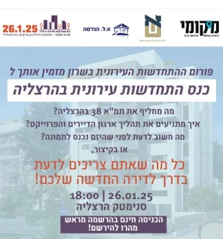 חושבים על עתיד ההתחדשות העירונית בהרצליה? הצטרפו אלינו לכנס התושבים הקרוב שאותו מארח mikumi.co.il נצלול לתוך מה שמחליף את תוכנית המתאר הארצית (תמ"א) בהרצליה ונחקור את השיטות המומלצות לתהליך התחדשות עירונית מוצלח.