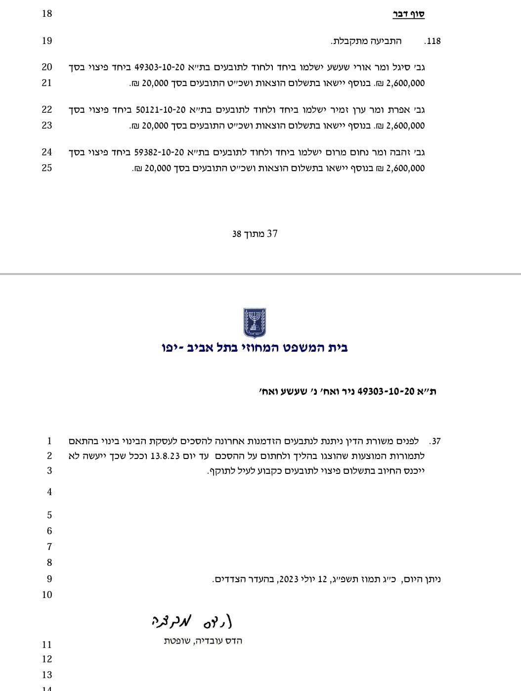 זו הבשורה שיצאה מבית המשפט המחוזי בתל אביב שבהחלטה חריגה חייב שלוש משפחות שמתנגדות לפרויקט (שעשע, מרום וזמיר) לשלם לתובעים פיצוי בסך 2,600,000 שקל כל אחת. בנוסף, כל משפחה חויבה לשלם הוצאות ושכ"ט התובעים בסך 20,000 שקל. בסך הכל נפסק לטובת התובעים פיצוי בסך של 7.8 מיליון שקל. לחלופין, אפשרה השופטת הדס עובדיה לנתבעים להימנע מתשלום הפיצוי אם יחתמו על הסכם הפינוי בינוי עד ליום 13.8.23.