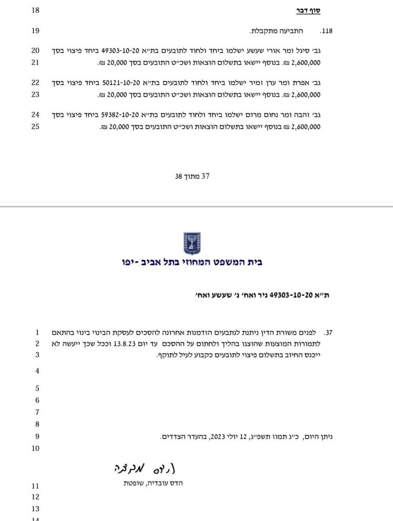זו הבשורה שיצאה מבית המשפט המחוזי בתל אביב שבהחלטה חריגה חייב שלוש משפחות שמתנגדות לפרויקט (שעשע, מרום וזמיר) לשלם לתובעים פיצוי בסך 2,600,000 שקל כל אחת. בנוסף, כל משפחה חויבה לשלם הוצאות ושכ"ט התובעים בסך 20,000 שקל. בסך הכל נפסק לטובת התובעים פיצוי בסך של 7.8 מיליון שקל. לחלופין, אפשרה השופטת הדס עובדיה לנתבעים להימנע מתשלום הפיצוי אם יחתמו על הסכם הפינוי בינוי עד ליום 13.8.23.